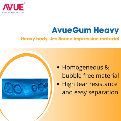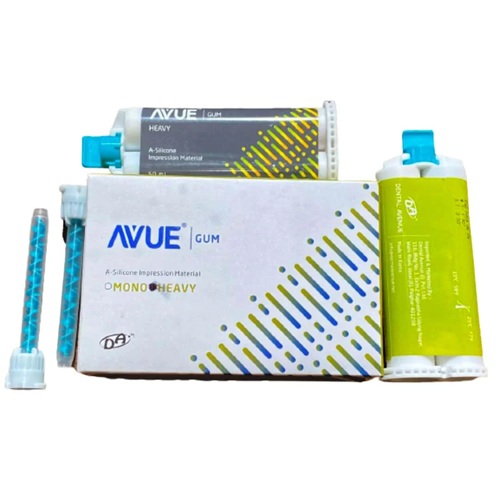 AvueGum Heavy is great for impressions involving one or multiple units and for using quadrant, double-bite and full arch trays. Sulfur contamination from latex gloves retard the setting of Putty and its viscosity is low compared to heavy body.So it is better to use AvueGum LIGHT BODY [Wash impression material]along with AvueGum HEAVY BODY[Tray material] for single or double-step impression taking.