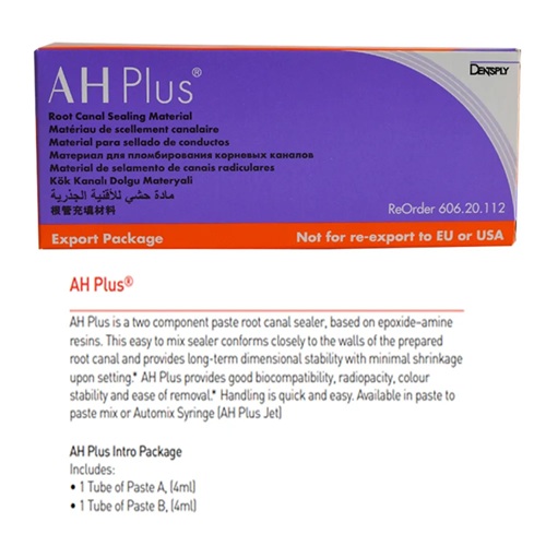 Dentsply AH Plus Root Canal Sealing Material is a two-component paste/paste root canal sealer based on epoxy-amine resin. The AH Plus sealer shows extremely low shrinkage making it a suitable choice of material to seal the root canal. It is a good sealer choice for use with ProTaper Thermafil obturators as the setting reaction is not adversely affected by thermoplastic obturation.