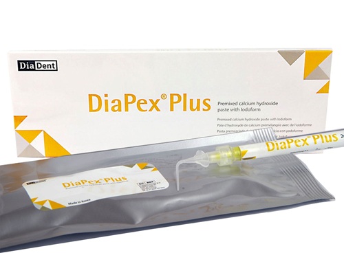 is an advanced endodontic material designed for temporary or permanent root canal procedures. This innovative solution comes in a dual-chambered syringe, streamlining the mixing process for a consistent blend of calcium hydroxide and iodoform. Ideal for post-pulpectomy applications, it effectively treats infected root canals and vital pulpotomies, especially in deciduous teeth. The addition of iodoform enhances radiopacity and introduces antibacterial properties to the paste. Diapex Plus stimulates hard tissue formation and apexification and finds application in treating traumatic injuries and root resorption cases. The pre-filled double syringe eliminates manual mixing, ensuring convenience and saving chair time. Designed for efficient placement with a plunger-type mechanism, Diapex Plus provides optimal accessibility to the root canal system. Manufactured in the USA by Diadent, this product represents a commitment to quality and serves as a reliable, quick, and user-friendly solution in endodontic practice.