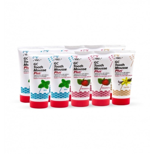 Tooth Mousse Plus are topical tooth crèmes that helps mineralise teeth. Both of the products bind calcium and phosphate to the tooth surfaces, plaque and surrounding soft tissue. They also contain RECALDENT (CPP-ACP), a special milk-derived protein that can help replace lost minerals in the teeth and helps protect them from decay and erosion. This technology has a unique ability to deliver bio-available calcium and phosphate when the patient’s saliva is acidically-challenged by the normal digestive process. Every healthy teeth’s need for calcium, phosphate and fluoride makes MI Paste and MI Paste Plus essential for every home and dental office. They are both available in three tasty flavors: mint, strawberry, and vanilla.