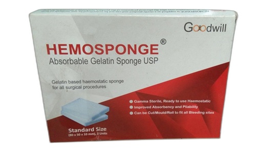 Hemosponge is sterile, gelatin based foam, intended for application to bleeding surface as hemostatis during surgery. It is fast, safe and effective haemostatic sponge having well established clinical safety profile. It effectively stops all kind of oozing blood, faster than natural clotting process. HEMOSPONGE is manufactured from highly purified gelatin (collagen derived protein). It is biodegradable (metabolised by proteoytic enzymes) and completely absorb in body within 4-6 weeks. The product is gamma sterilized. For detailed uses, mechanism of action, precautions, contraindications.