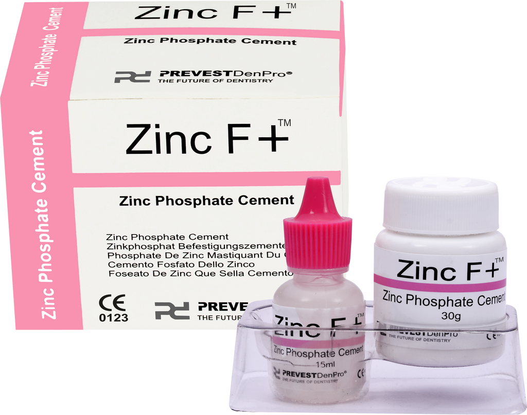 is a zinc phosphate cement which has universal application for crowns and bridges and bridges and as a liner/core or base material. Zinc F+ offers an extremely accurate fit with very high mechanical strength.