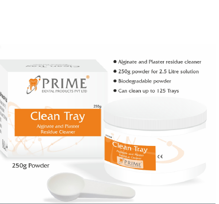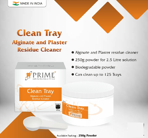 Prime Dental Clean-Tray effectively removes alginate or plaster residue from dental instruments like impression trays, spatulas, and flasks. Its white powder formulation, with 250g cleaning power, efficiently cleans at least 125 trays. Safe and versatile, it lacks known contraindications. Following precise usage guidelines, dissolve 50g in 0.5 liters of lukewarm water, soak instruments for 15-30 minutes, then brush and rinse. Warm water or ultrasonic baths enhance results. Be cautious when cleaning different metal trays together to prevent oxide layer formation. Store in a cool, dry place away from sunlight and tightly seal after each use. Dispose of according to local regulations. Prime Dental Clean-Tray stands as a reliable solution for maintaining dental instruments, emphasizing quality and innovation in dental hygiene.