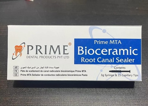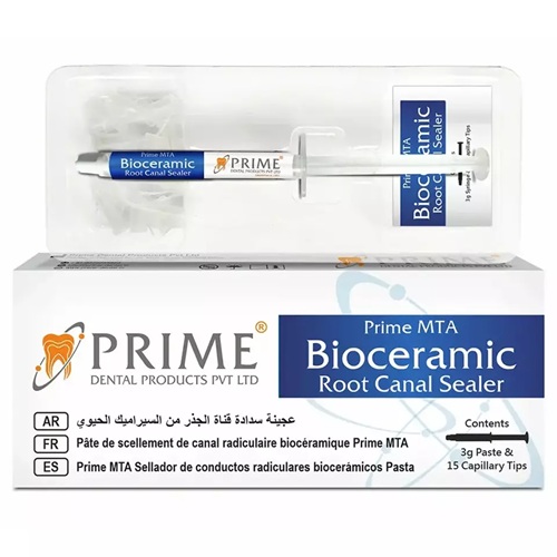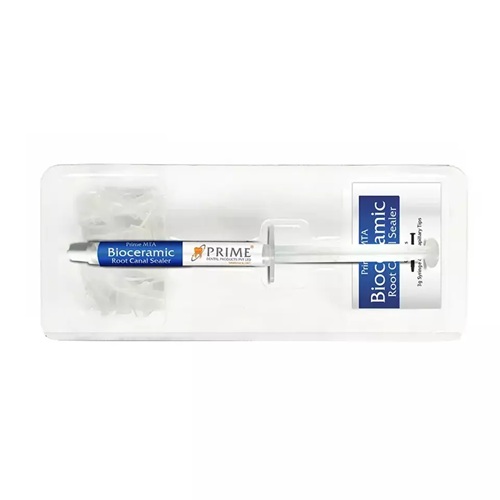 is an advanced, premixed solution for seamless root canal procedures. Expertly composed with fine hydrophilic particles, this sealer harnesses the benefits of Mineral Trioxide Aggregate (MTA) technology. Its thin consistency ensures easy handling, while the radiopaque formulation enables precise visualization during X-rays. Beyond its convenience, the sealer exhibits superior physical properties and sets robustly in the presence of moisture. This bioceramic sealer not only simplifies the application process but also guarantees a secure and enduring seal. Trust in Prime MTA Bioceramic Root Canal Sealer for optimal endodontic outcomes with efficiency and precision.